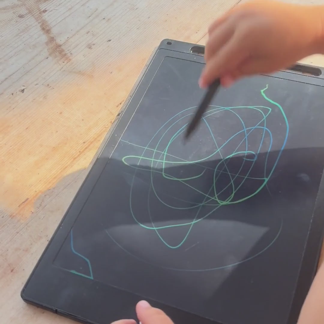 Med sin färgstarka LCD-skärm och tryckkänsliga yta låter ritplattan barnet skapa linjer som varierar i tjocklek beroende på hur hårt de trycker. Och den regnbågsfärgade ytan gör varje streck levande – som om fantasin själv fått en egen plats att ta form.